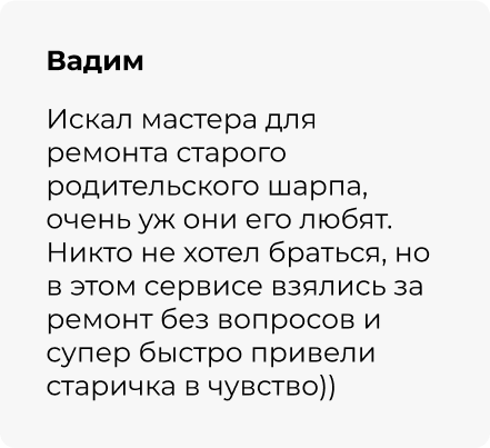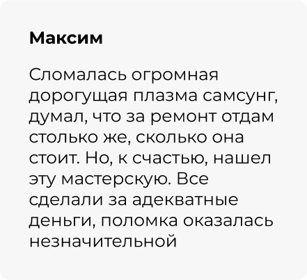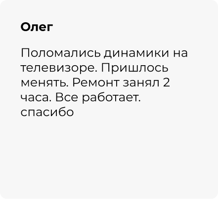 За эти годы небольшой частный бизнес превратился в серьезную компанию с командой прекрасных специалистов. Но одно осталось неизменным — я лично слежу за качеством работы телемастерской и отвечаю своей репутацией.